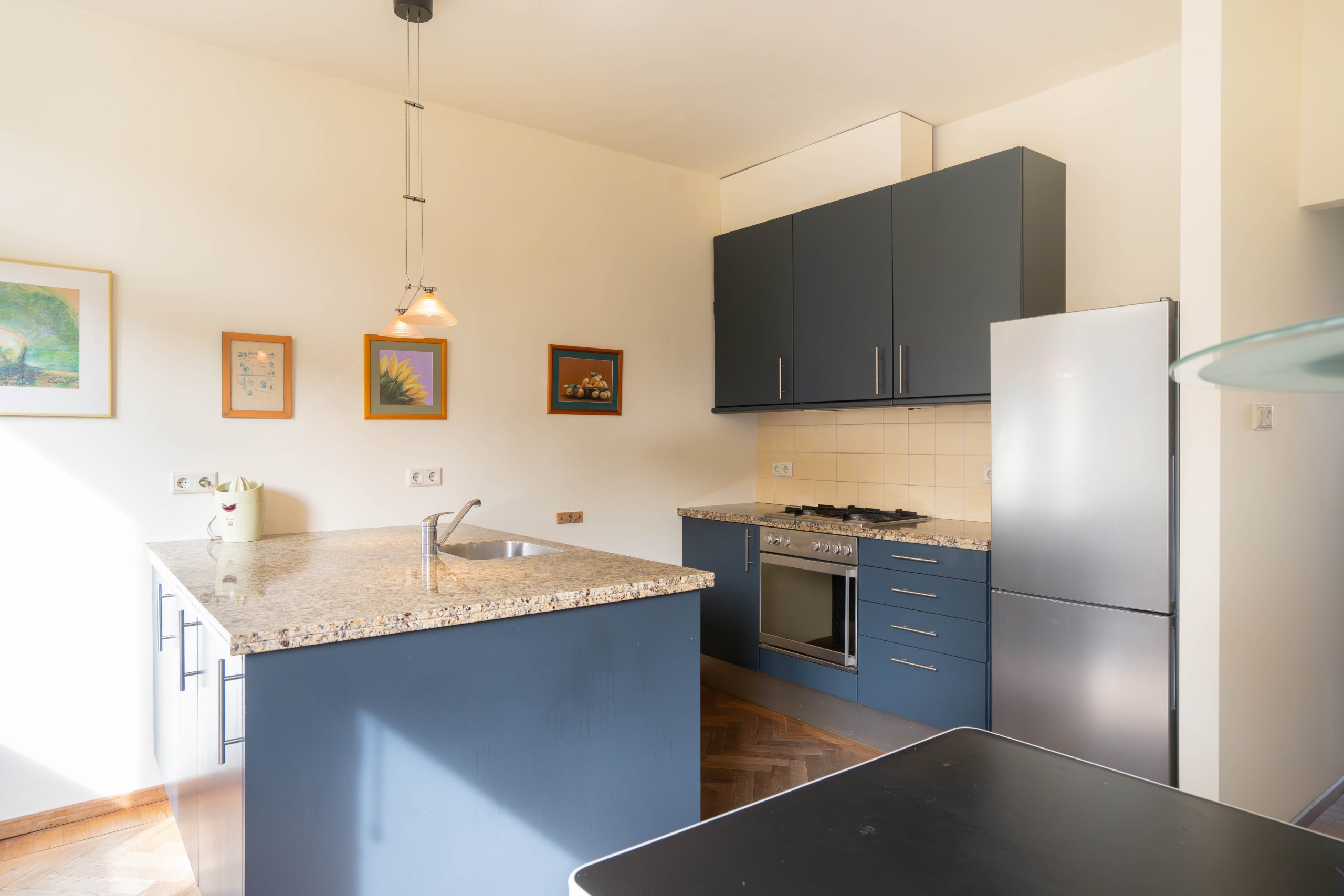 At the rear, you’ll find the kitchen, fitted with all necessary appliances and access to the first balcony. The kitchen is also equipped with awnings, providing pleasant light and cooling. There is ample space here to create a comfortable dining area.