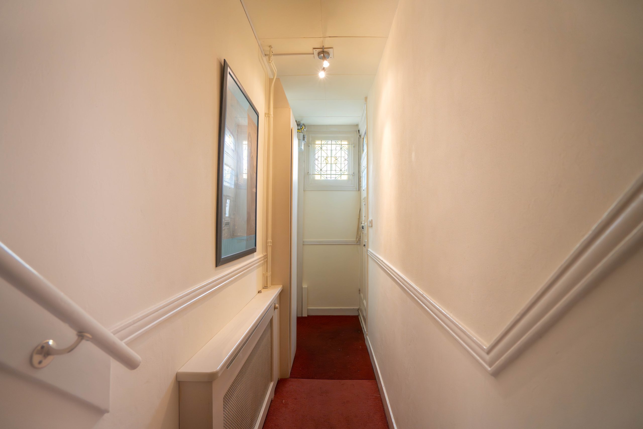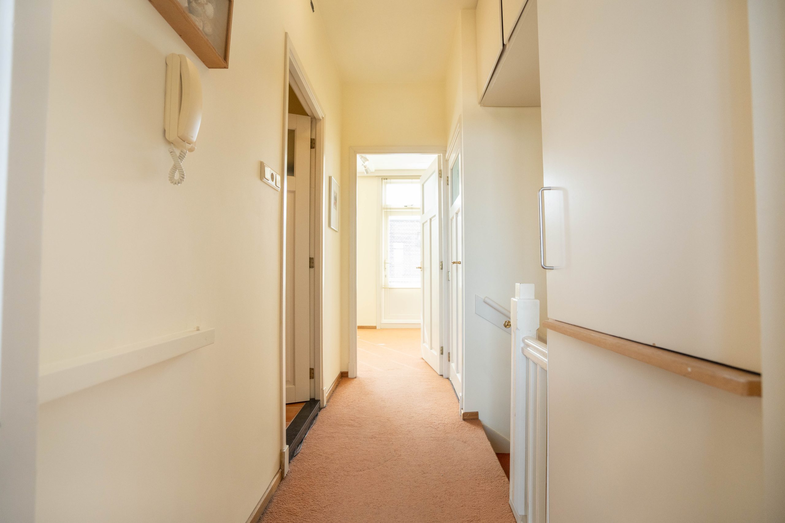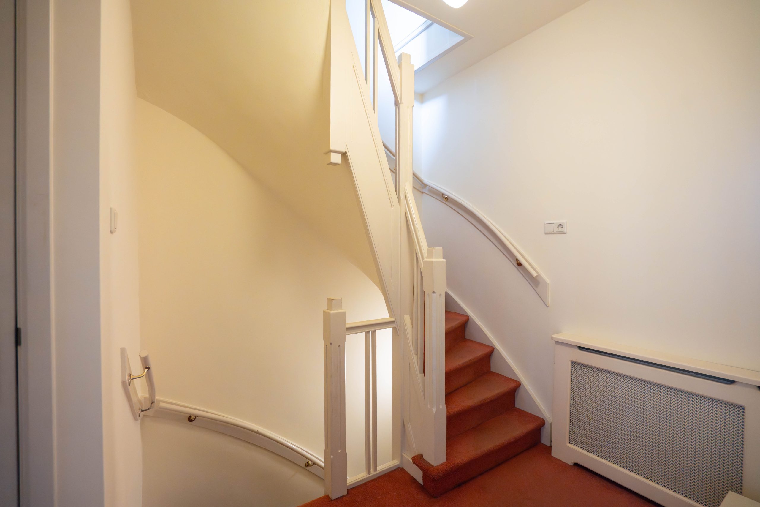 Via the private entrance at street level, you reach the first floor of the property by stairs. Upon entering, you step into a spacious hallway with access to a separate toilet and stairs leading to the sleeping quarters. At the front of the house, you will find the spacious and bright living room with large windows and a cozy fireplace.