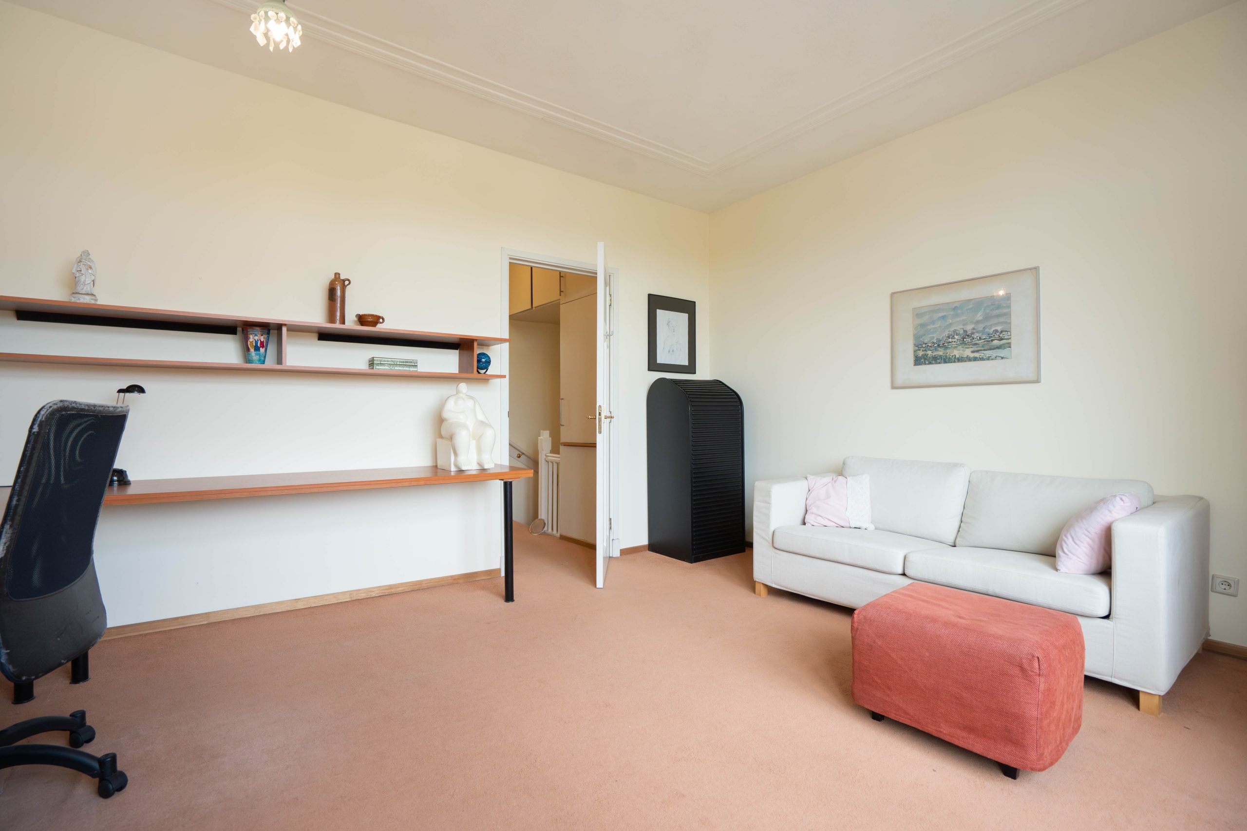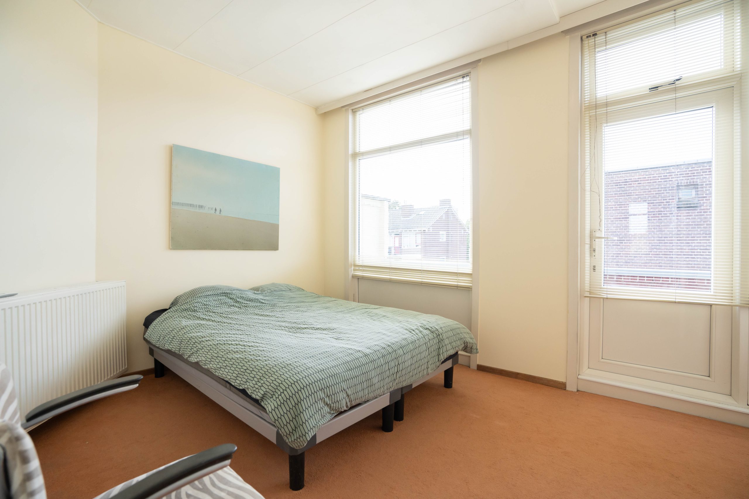 On the upper floor, there are two spacious bedrooms and the bathroom. The largest bedroom is at the front and offers more than enough room for a double bed and wardrobes. Thanks to its generous size and natural light, this room also lends itself perfectly to incorporating a home office. From this bedroom, you also have access to the second balcony.
