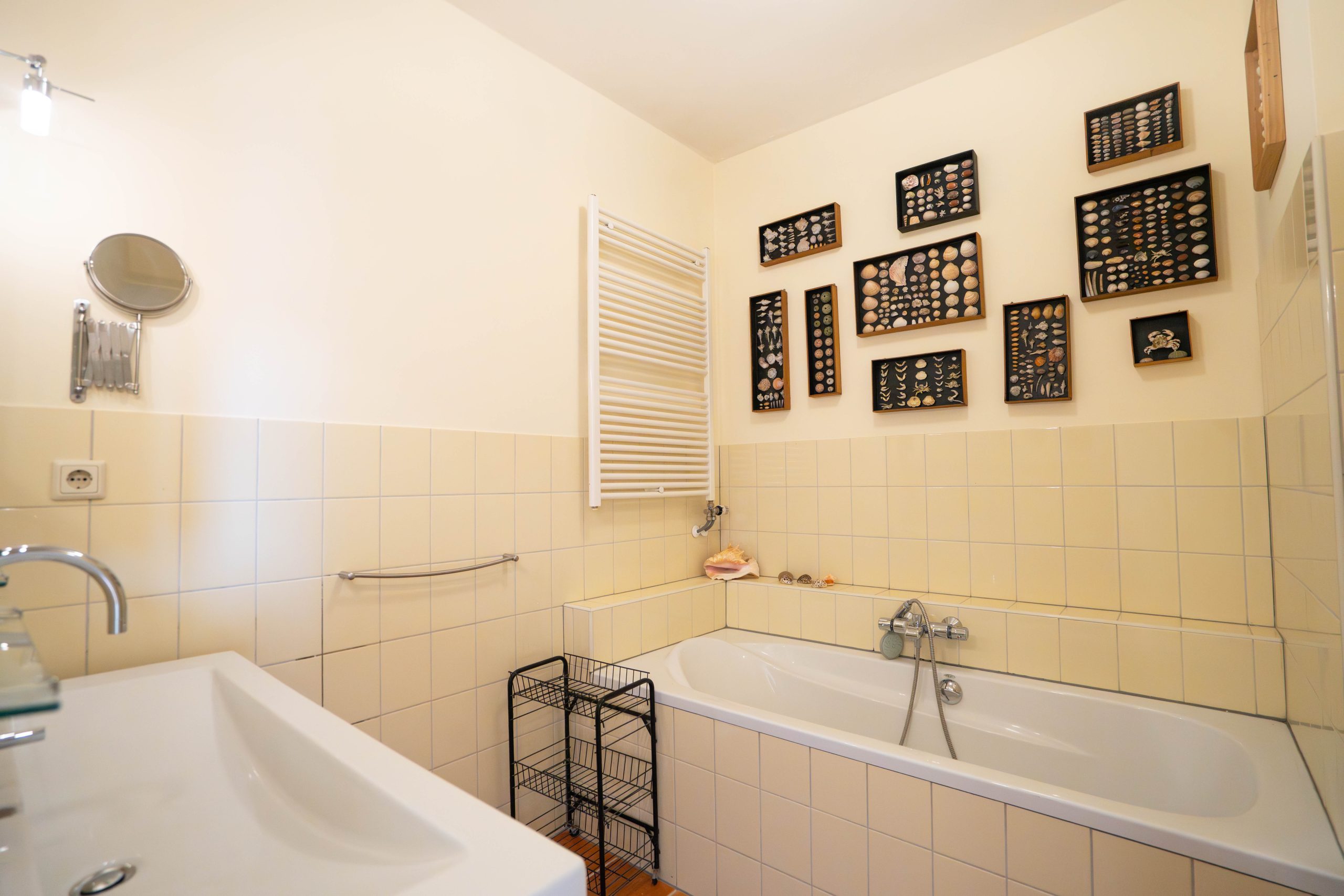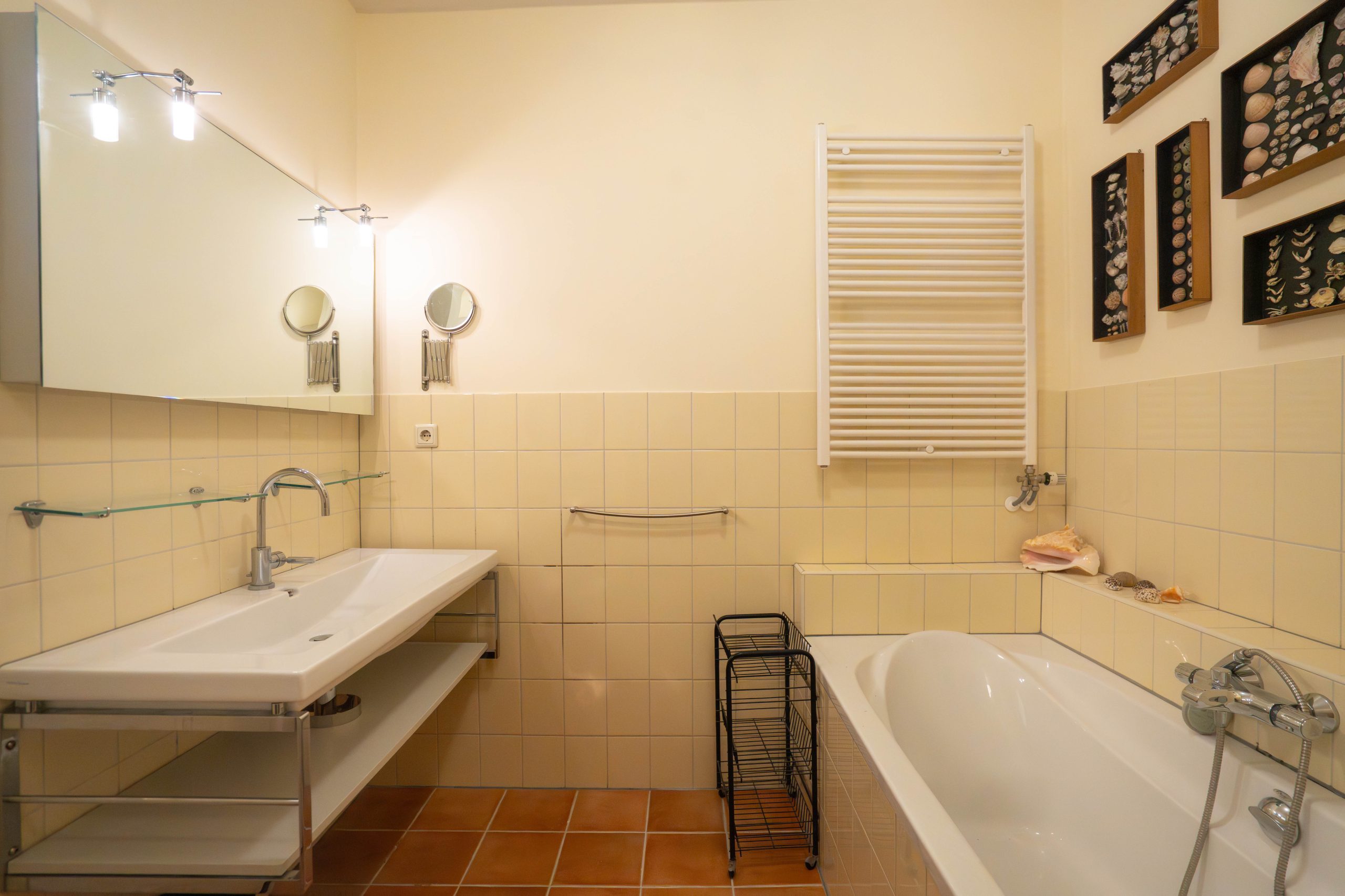 The centrally located bathroom is fitted with both a bathtub and a separate shower, a washbasin, and connections for a washing machine and dryer. This floor also has a second, separate toilet.